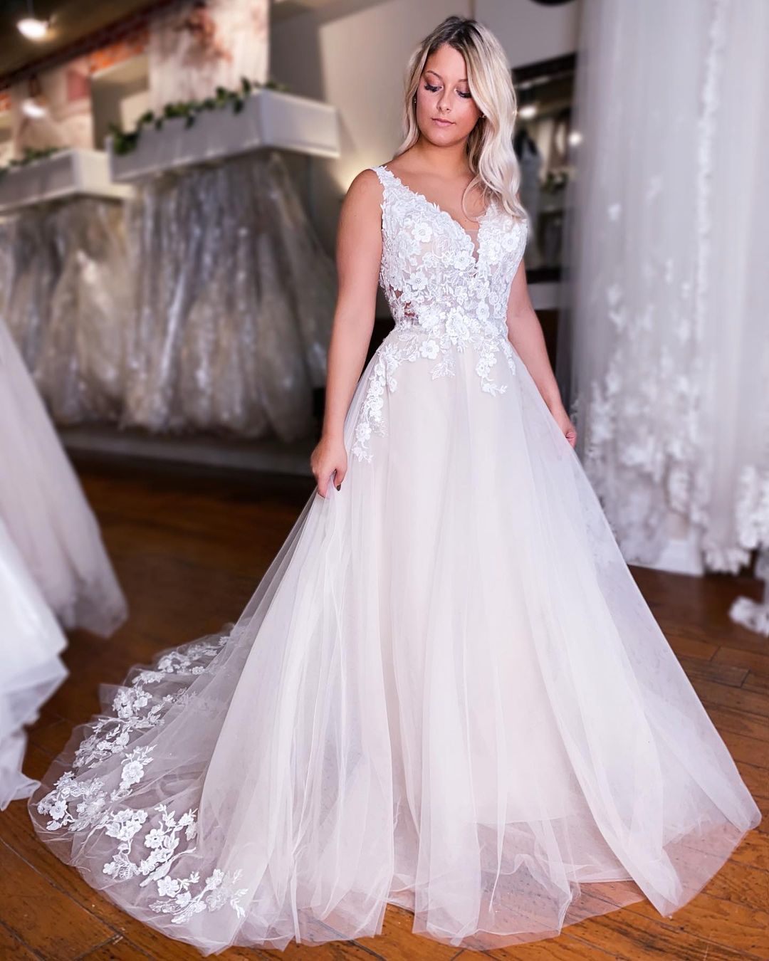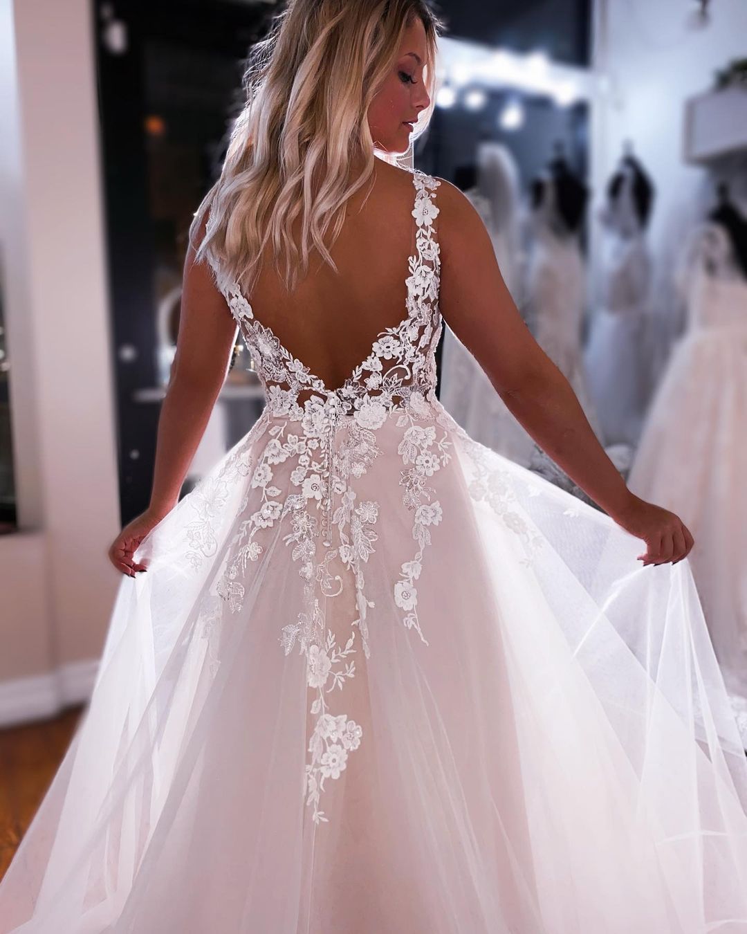 Features: A Line V Neck Tulle Lace Wedding Dresses