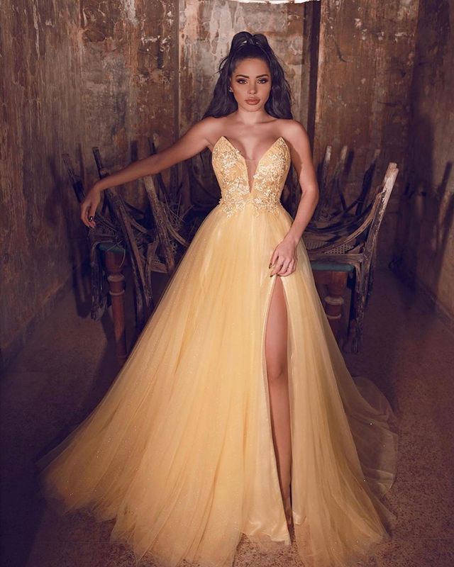 Beauty A Line V Neck Yellow Tulle Slit Prom Dresses with Appliques