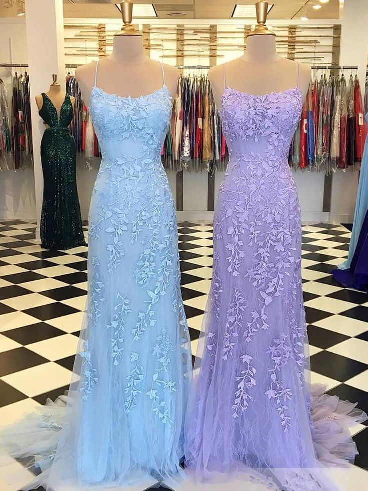 Mermaid Scoop Neck Straps Light Blue Lace Prom Dresses