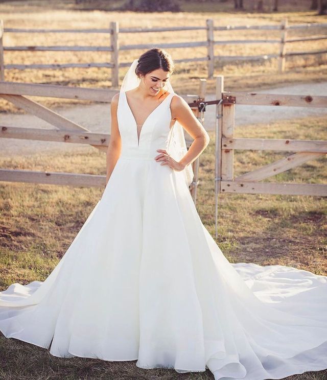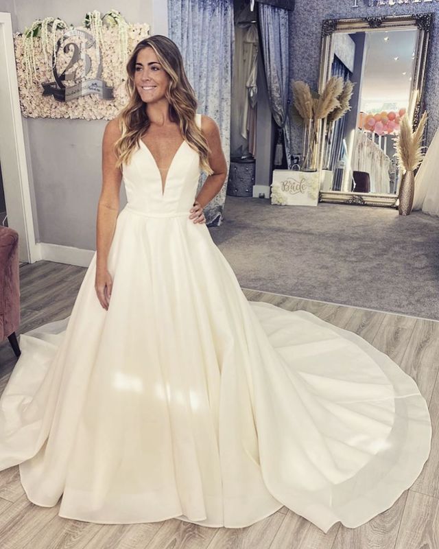 Gorgeous Ball Gown V Neck Organza Satin Wedding Gowns with Button