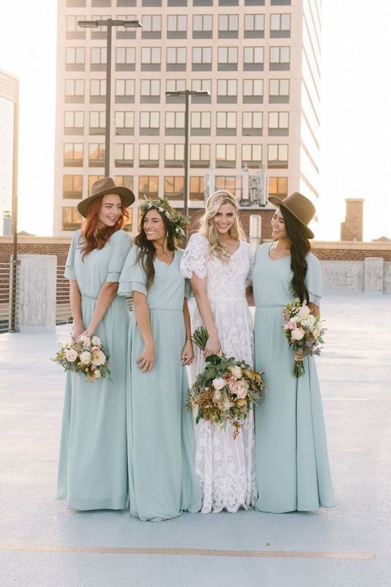 Elegant A-Line V Neck Short Sleeve Mint Green Long Bridesmaid Dress
