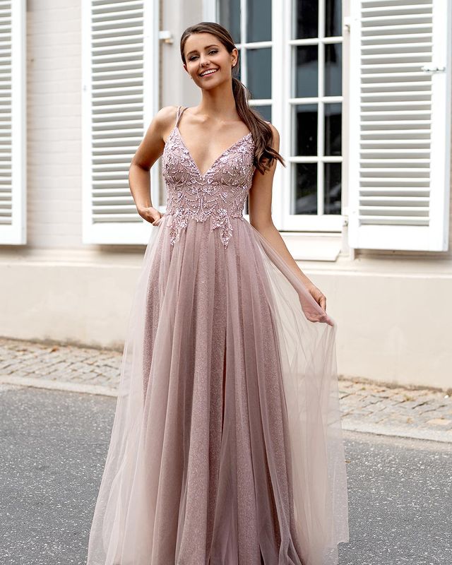 Features: Blush Pink Beaded Long Prom Dresses Evening Dress