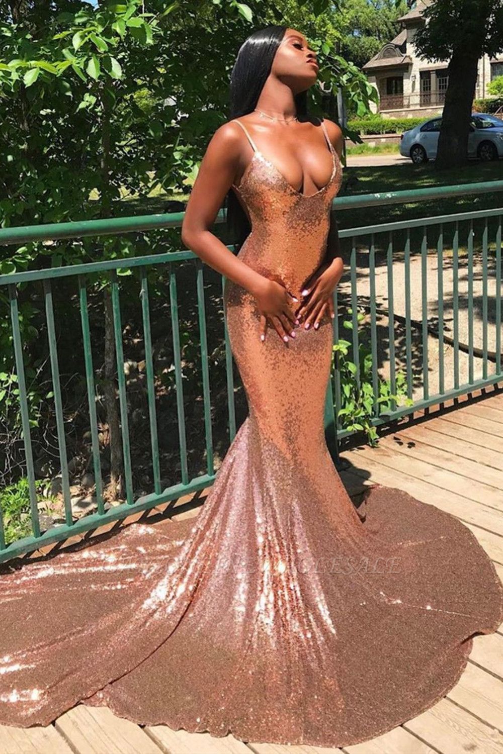Sexy Mermaid V Neck Sequin Long Prom Dresses with Train