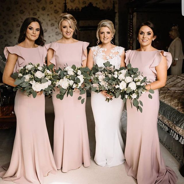 Mermaid Blush Pink Long Bridesmaid Dresses with Ruffle Sleeves