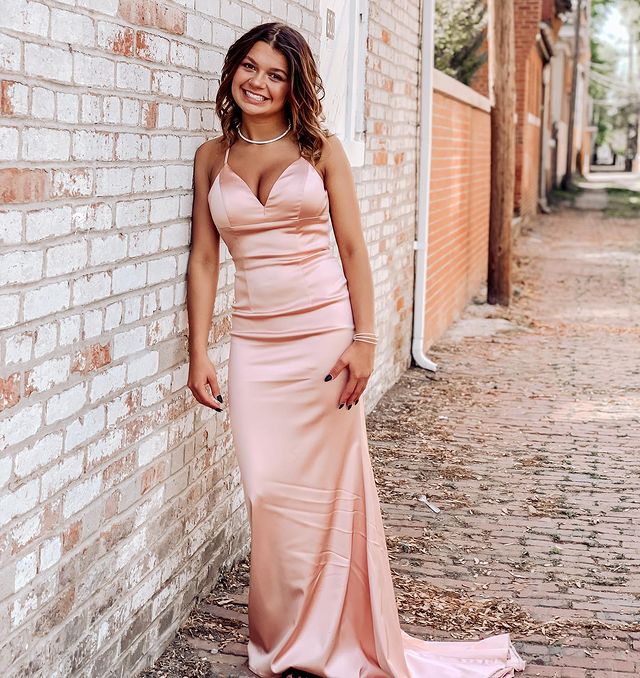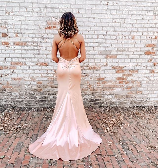 Mermaid Blush Pink Silk Satin Long Prom Evening Dresses with Cross Back