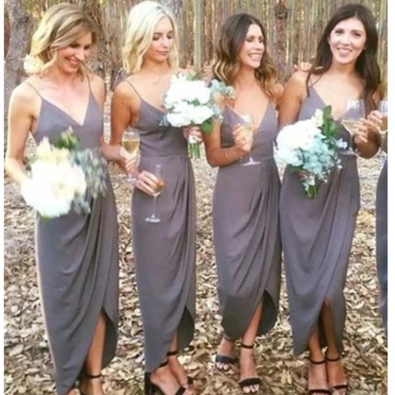 Grey Spaghetti Straps Side Slit Bridesmaid Dresses Online, Cheap Bridesmaids Dresses