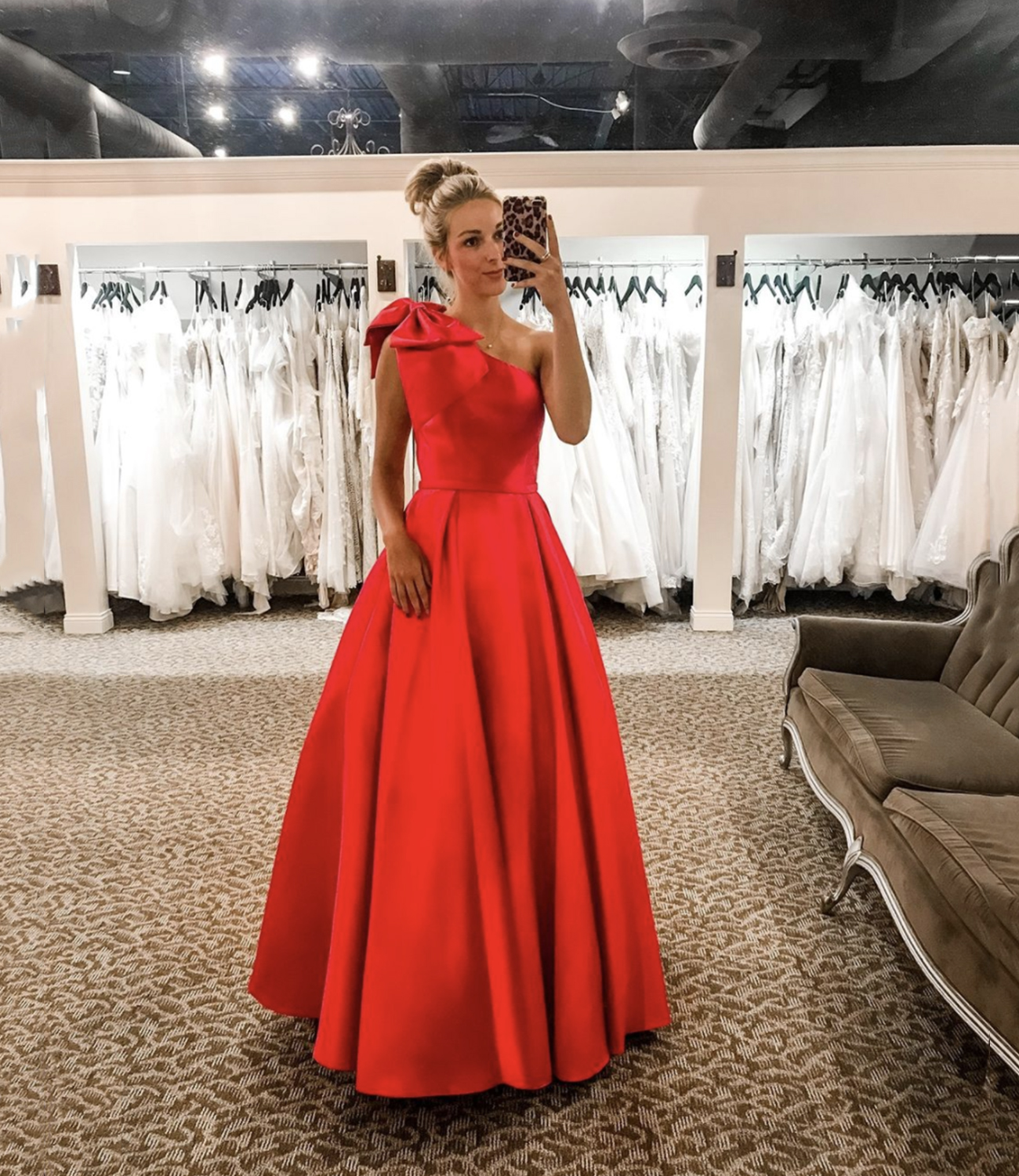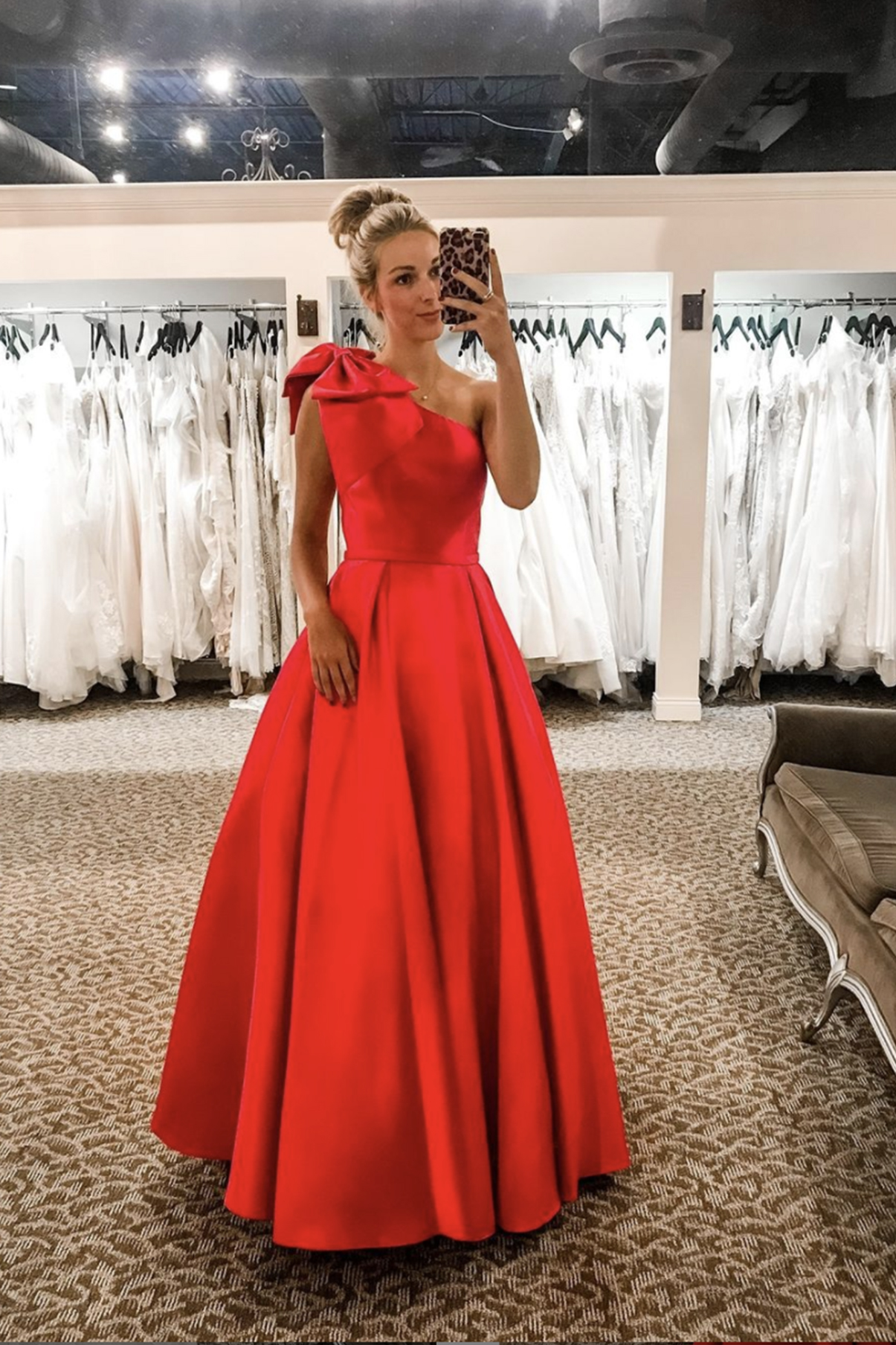 Modest A-Line One Shoulder Red Satin Long Prom Evening Dresses with Bow