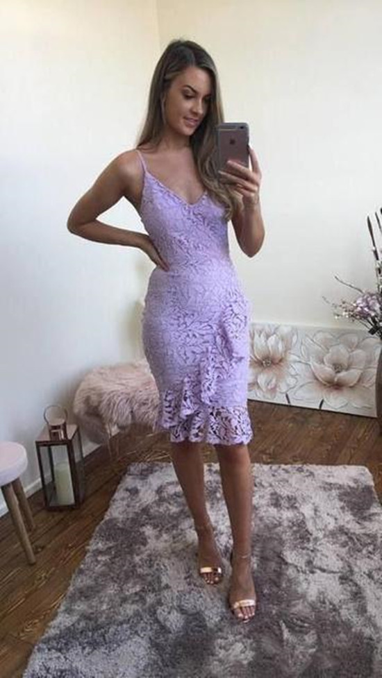 Chic Bodycon V Neck Spaghetti Straps Lavender Lace Knee Length Prom Homecoming Dresses