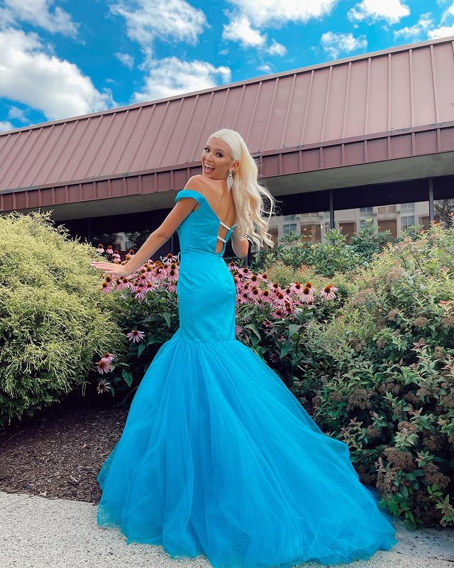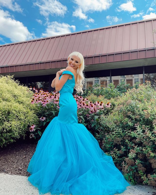 Exquisite Mermaid Off the Shoulder Lake Blue Tulle Long Prom Dresses