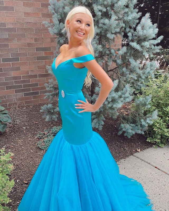 Features:Off the Shoulder Blue Satin Long Prom Evening Party Dresses