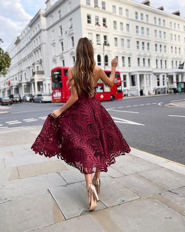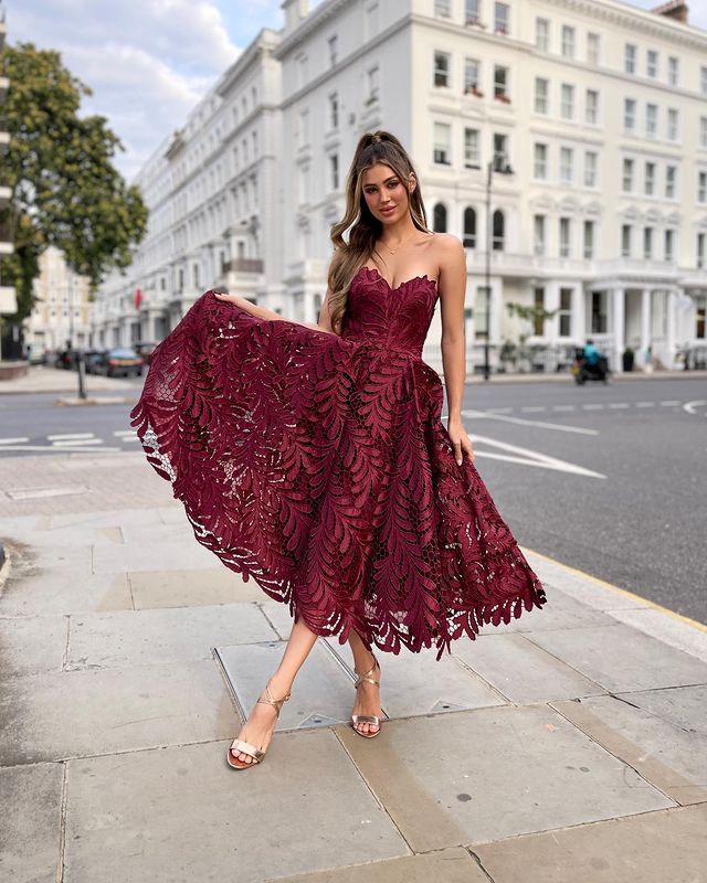 Unique A Line Sweetheart Burgundy Lace Tea Length Party Dress, Evening Dress