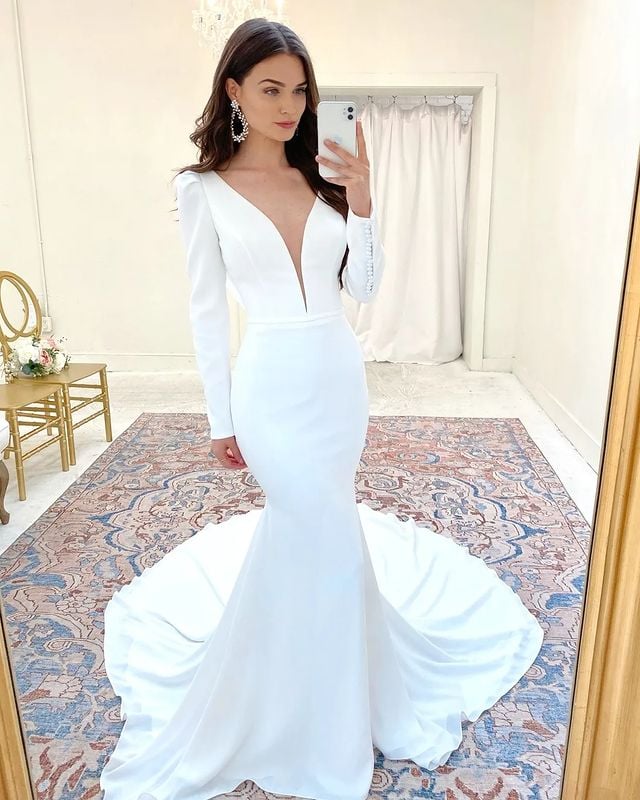 Elegant Mermaid Deep V Neck Long Sleeves Wedding Dress with Button