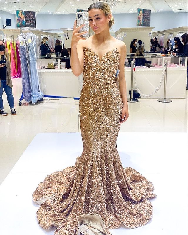 Stunning Sparkly Mermaid Gold Velvet Sequins Prom Dress for 2022