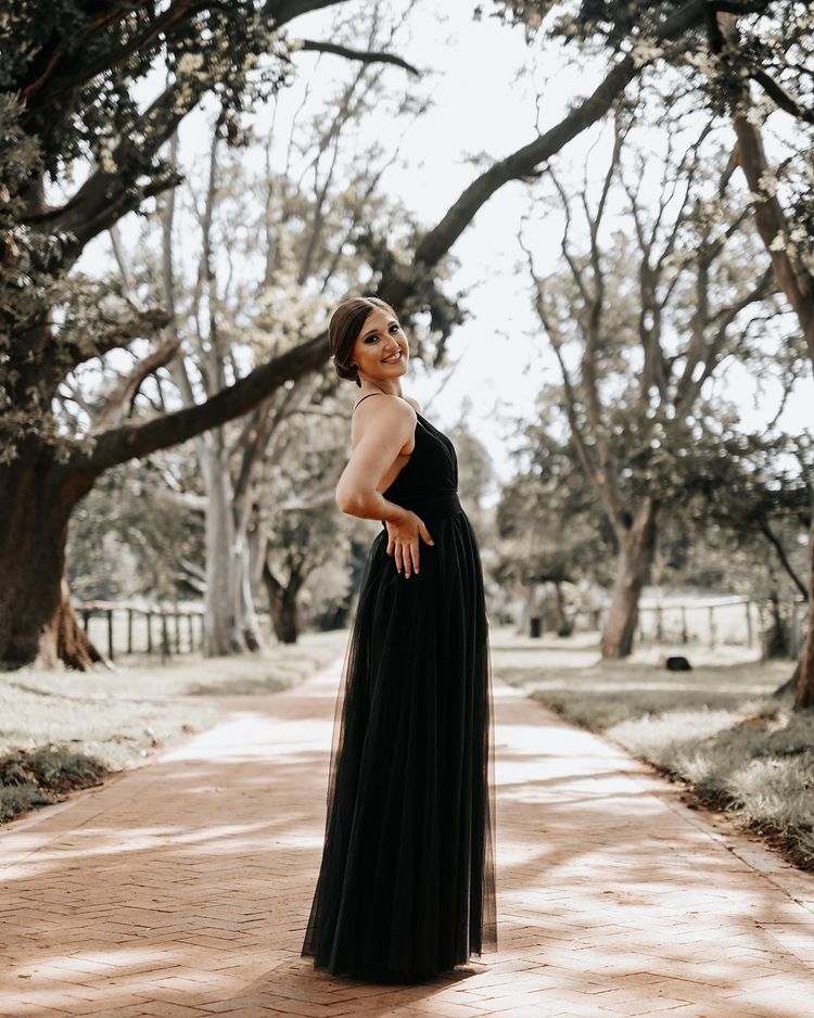Simple A-Line Deep V Neck Black Tulle Long Prom Dresses