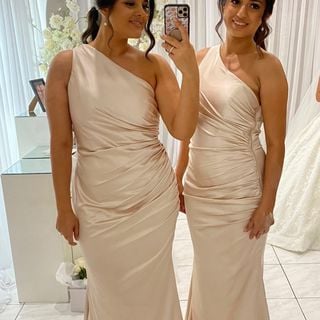 Elegant One Shoulder Champagne Satin Long Bridesmaid Dresses