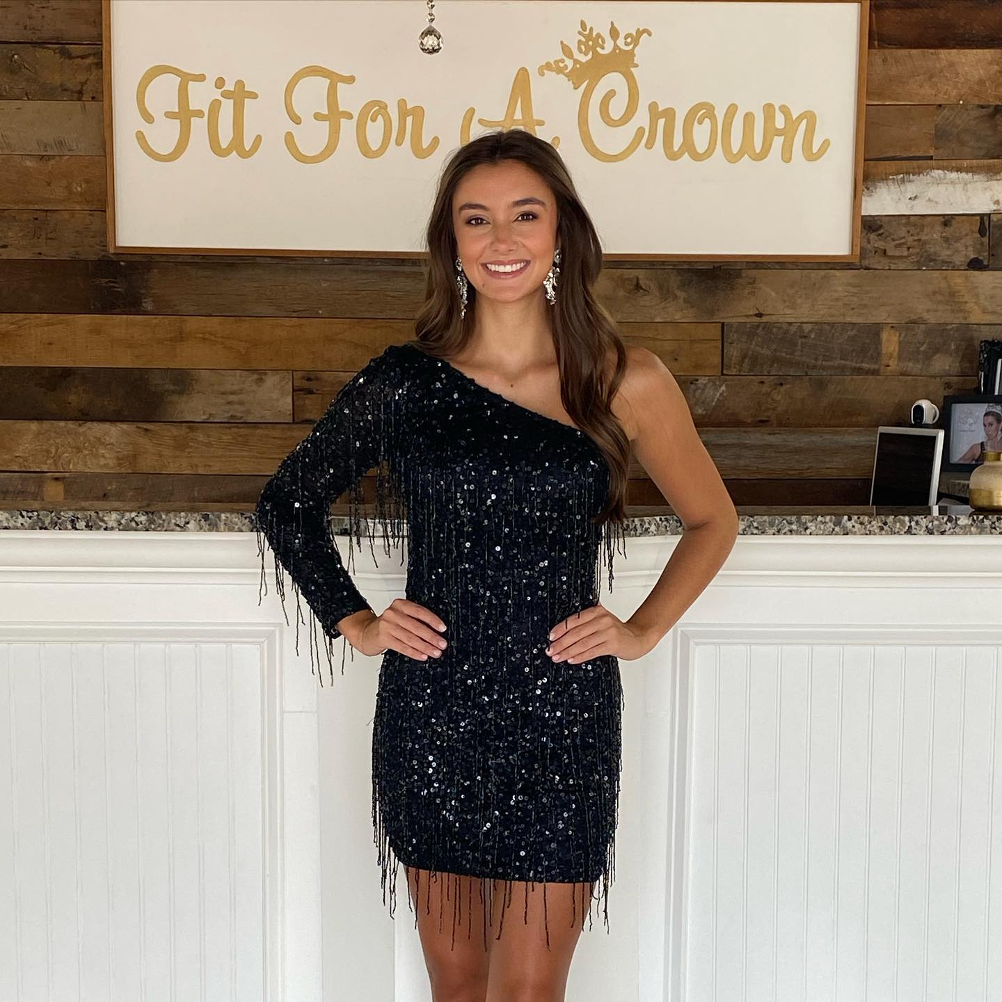 Sparkly One Sleeves Black Sequins Short Homecoming Dresses with Beading