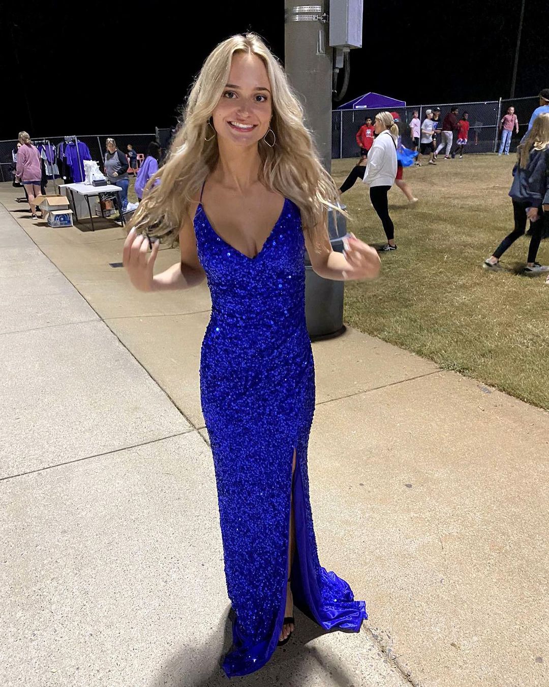 Sweet Mermaid V Neck Royal Blue Sequins Long Prom Dresses with Slit