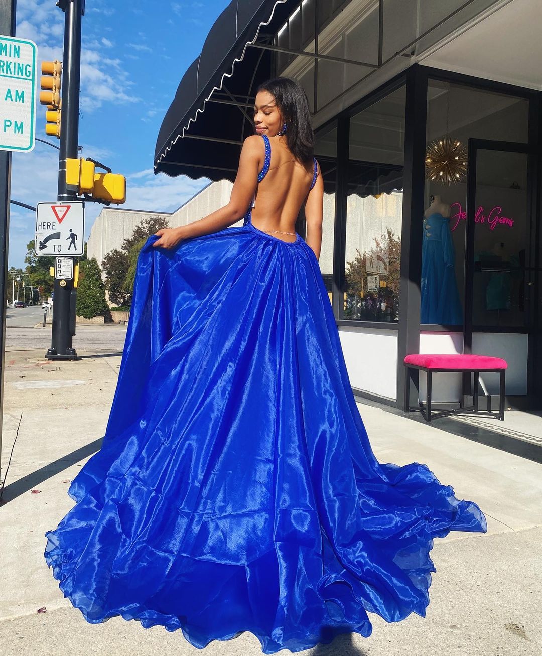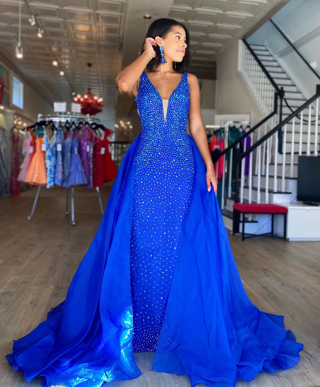 Cute Two Piece V Neck Royal Blue Prom Dresses with Detachable Train