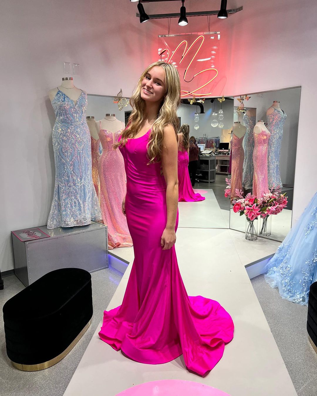 Cute Mermaid Scoop Neck Hot Pink Satin Prom Dresses