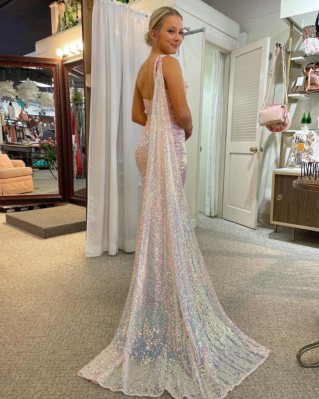 Features: Mermaid Pink Sequins Prom Dresses