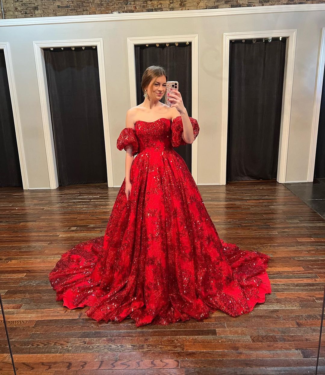 Cute Ball Gown Sparkly Lace Red Prom Dresses