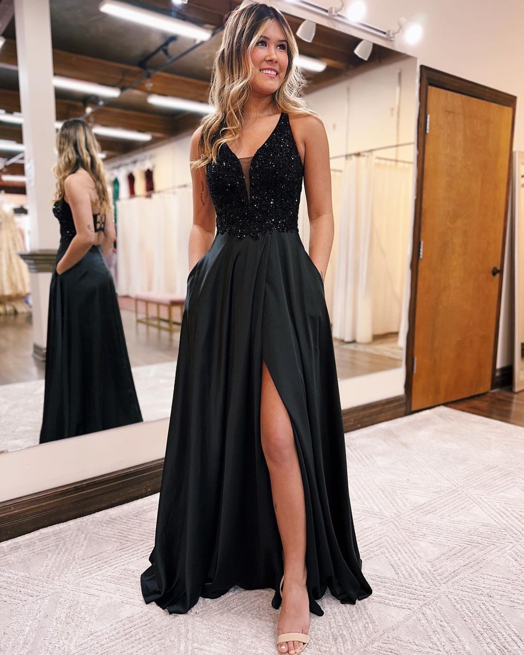 Cute A Line V Neck Black Satin Long Prom Dresses with Beading