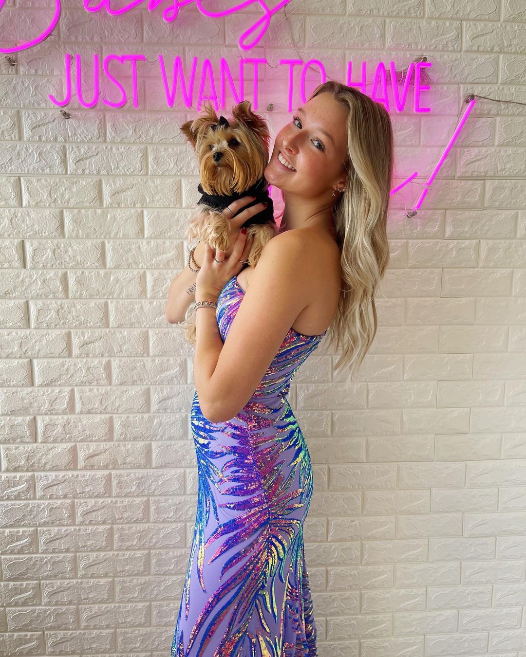 Charming Mermaid One Shoulder Light Purple Sequins Prom Dresses with Slit
