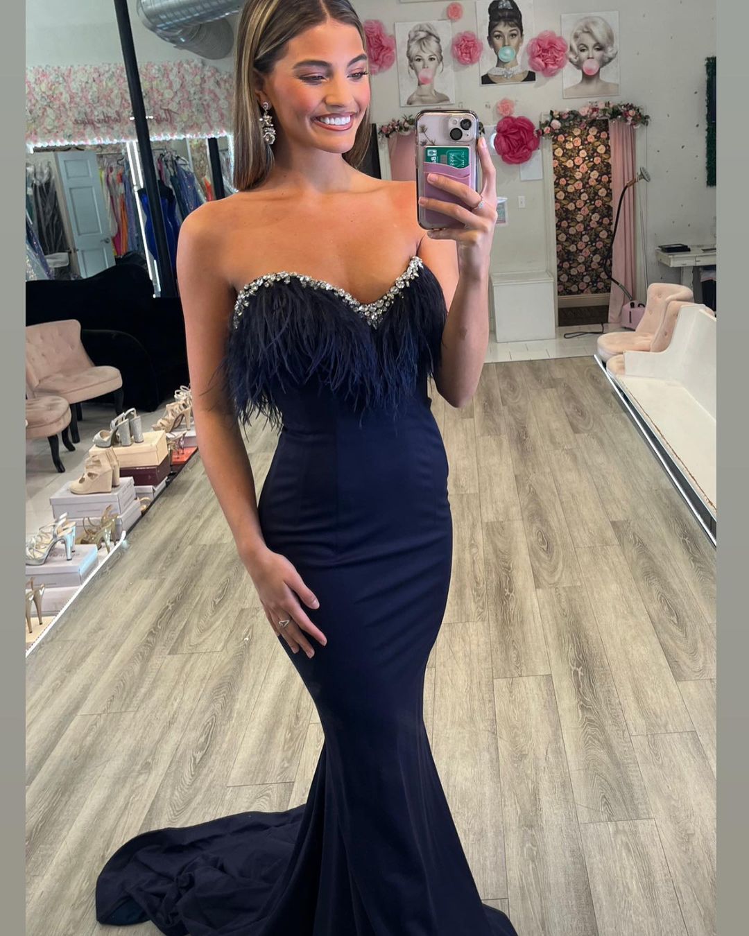 Charming Mermaid Sweetheart Navy Satin Prom Dresses with Feather